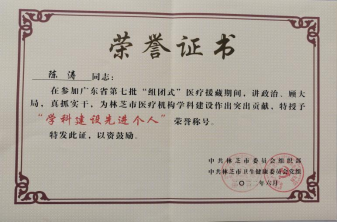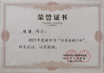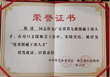 援藏期间,陈涛守初心、担使命,用心用情用力做好各项对口支援工作,得到当地领导、同事、群众的高度评价。2021年荣获中共林芝市人民bet9九州 委员会、林芝市人民政府颁发的“优秀援藏干部”荣誉称号、2022年荣获中共林芝市委员会、林芝市人民政府颁发的“优秀援藏干部人才”荣誉称号,2022年林芝市委组织部、林芝市卫健委授予“学科建设先进个人”荣誉称号。