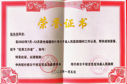 半年的援疆工作,张丹丹同志努力克服高原严寒缺氧,连续奋战在海拔3000多米的高原防疫抗疫和救死扶伤第一线,用实际行动践行了援疆精神,得到当地领导、同事、群众的高度评价,被中共塔什库尔干塔吉克自治县委员会、塔什库尔干塔吉克人民政府授予“优秀工作者”称号。