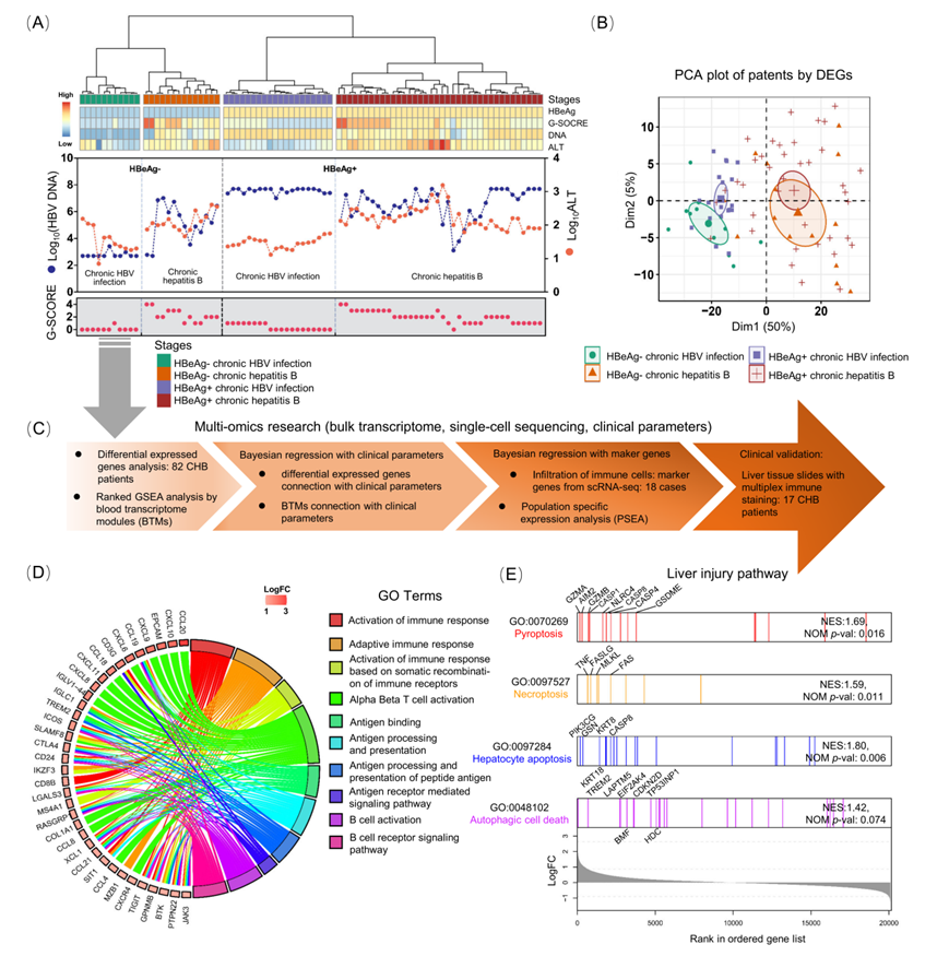研究团队首先对82例 CHB患者根据临床数据进行了无监督聚类(图2A)。主成分分析(PCA)结果显示,根据各组间差异表达基因(DEGs),可以将慢乙肝炎症患者与慢性感染患者区分开来(图2B)。然而,患者的HBeAg阳性或阴性状态在PCA图中并未明显区分。我们将排名前35的差异表达基因进行GO分析。结果显示与免疫过程相关的通路被显著富集(图2D)。进一步的基因富集分析显示(图2E),在多种已知的肝损伤途径中(包括焦亡、程序性坏死、凋亡和自噬性细胞死亡),凋亡相关的通路具有最高的富集分数。这些发现进一步指出了宿主免疫反应与肝损伤之间的关联。