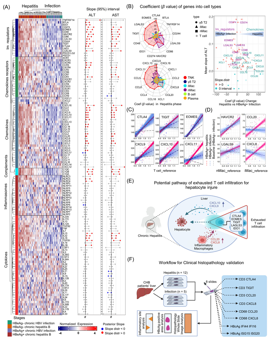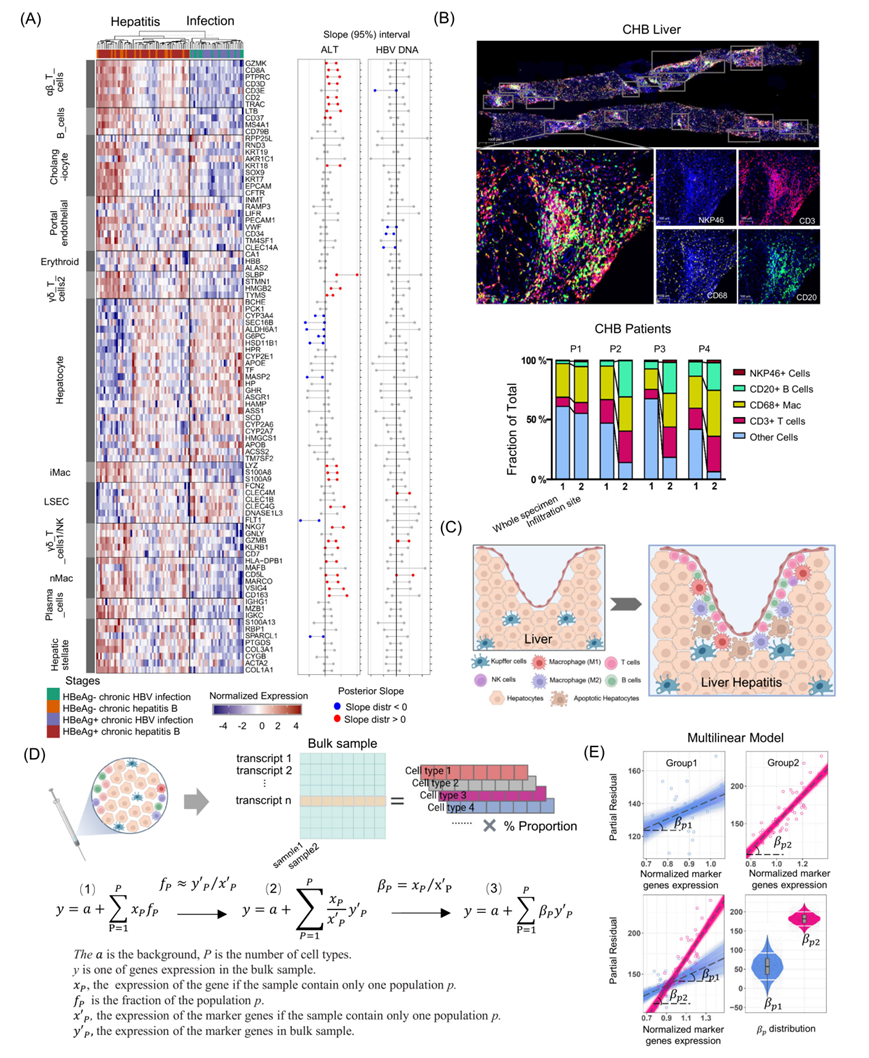 基于上述背景与领域研究局限,研究团队采取将肝脏组织转录组数据与单细胞测序数据和临床数据相结合,从多组学角度分析CHB中肝脏炎症的形成因素。研究团队开发了一种贝叶斯线性模型,用于研究基因表达和临床参数之间相关性。此外,通过从CHB患者和健康肝组织获得的单细胞测序数据筛选出细胞类型标志基因,研究团队进一步更新了细胞特异性表达分析方法(PSEA),在不同临床阶段将整体基因表达拆分为特定细胞类型的表达。研究团队将这两个模型整合到一起分析之前报道的与肝脏炎症相关的免疫过程,如炎症细胞浸润、免疫细胞活化、T细胞耗竭、趋化因子及其受体表达、先天免疫活化和干扰素刺激基因(ISGs)表达,绘制了一张更全面的CHB肝脏炎症发生图谱。此外,通过对CHB患者肝组织样本进行多重免疫染色加以验证。