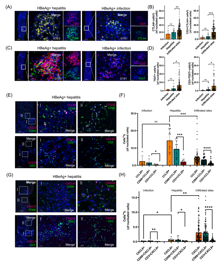 为了验证多组学分析得到的结果,研究团队将来自17名CHB患者的肝组织切片分为两个不同的临床组:12名HBeAg阳性肝炎患者和5名HBeAg阳性但无肝脏炎症的感染患者。通过对CHB患者肝组织样本进行多重免疫染色加以验证, 得到T细胞耗竭标志物及巨噬细胞活化相关趋化因子的病理验证(图6)。