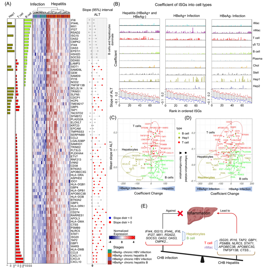 理解宿主免疫反应、肝损伤与病毒控制之间的关系对慢性乙型肝炎(CHB)的研究至关重要。宿主免疫反应对于控制病毒复制至关重要,但在CHB患者中,肝内免疫活化未能有效控制HBV,导致肝损伤。因此,直接干预肝脏炎症的方法对于实现CHB的功能性治愈至关重要。研究团队整合了肝脏组织转录组数据、单细胞测序数据和临床数据,从多组学的视角分析了引发CHB肝脏炎症的因素。分析结果与之前的研究保持一致,即增加免疫细胞的肝内浸润导致肝损伤,且无法有效抑制HBV复制,而持续的HBV感染会进一步导致免疫细胞功能耗竭。在CHB肝炎阶段,肝细胞内的先天免疫被抑制,阻碍了ISGs发挥抗病毒效果,免疫细胞被招募并在肝脏中活化,是表达ISGs表达上调的主要来源,可进一步加剧了炎症形成。因此,肝内细胞群体异质性很强,随时间动态变化,并在肝组织中显示不均匀的空间分布。这也解释了不同ISGs的表达及其与ALT值的不同相关性。T细胞中激活的ISGs参与或进一步诱导肝内炎症形成。B细胞和肝细胞中激活的ISGs可能对肝脏的炎症损伤有保护作用。