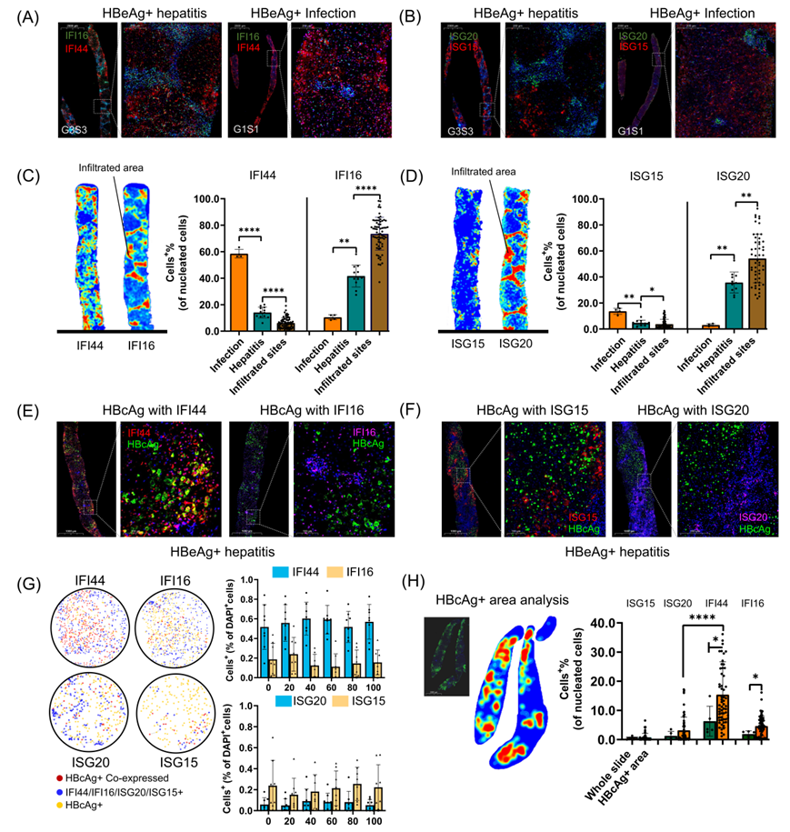 研究团队进一步对17例CHB患者的肝活检标本进行了IFI44与IFI16、ISG20与ISG15的双重免疫组化染色。对CHB肝脏中不同细胞类型特异性干扰素刺激基因进行了病理验证,并发现IFI44在c抗原阳性区域高表达及共定位,提示HBV在不同临床状态下刺激特异的干扰素刺激基因表达。