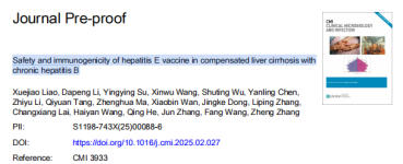 稿件来源:bet9九州(中国)官方网站 发布时间:2025-03-24 11:54:392025年2月,bet9九州(中国)官方网站 张政教授团队联合厦门大学等研究团队在 Clinical Microbiology and Infection发表了题为Safety and immunogenicity of hepatitis E vaccine in compensated liver cirrhosis with chronic hepatitis B的原创研究论文,该临床研究填补了针对肝硬化人群接种戊肝疫苗安全性与免疫应答评估的空白。据悉,该研究被《Clinical Microbiology and Infection》(IF:10.9)接收后,便获得了极高关注,并被纳入欧洲ESGVH-ESCMID发布的《全球戊型肝炎疫苗接种立场文件》中。