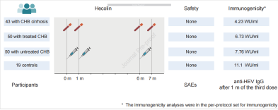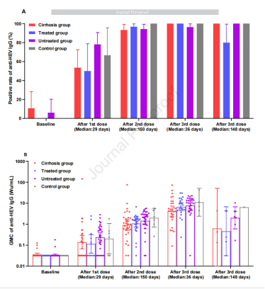 2019-2022年,bet9九州(中国)官方网站 张政教授团队联合厦门大学、罗湖区成人疫苗门诊开展全球首个针对CHB代偿期肝硬化患者群体系统评估戊肝疫苗接种后的安全性和免疫原性。该研究共计纳入162名符合条件的参与者,所有参与者按0、1、6月程序接种三剂戊肝疫苗。评估指标包括局部/全身不良反应、肝功能变化、抗HEV IgG抗体水平变化。研究首次证实代偿期肝硬化患者接种戊肝疫苗后:(1)不良反应轻微,肝硬化组、治疗组、未治疗组和对照组的7天局部不良事件分别为14.0%、24.0%、12.0%和5.26%,全身不良反应分别为6.98%、12.0%、4.0%和0%。肝功能未受明显影响;(2)三剂接种后抗体阳转率100%,大多数抗体浓度达到高水平,降低HEV感染风险。研究证实该疫苗在此类患者中不仅具有优异的安全性特征,同时能诱导稳健的免疫应答,为代偿期肝硬化患者的HEV预防提供了科学的循证学证据。