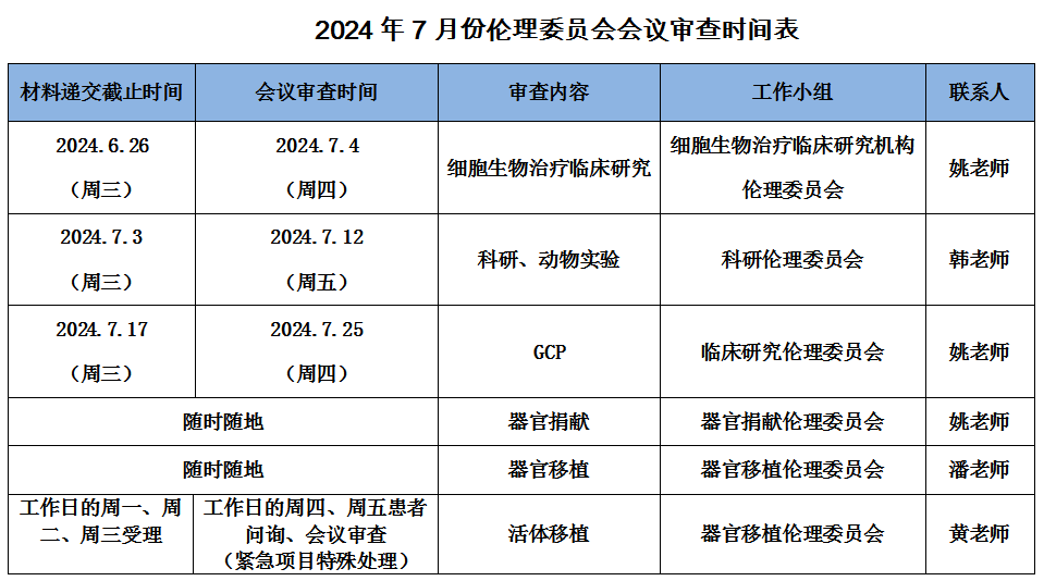 2024年7月份伦理委员会会议审查时间表