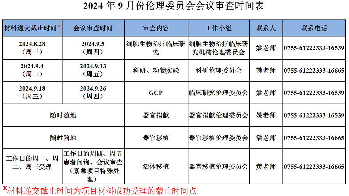 伦理委员会2024年9月份会议审查时间安排如下,如有临时调整,将另行通知。为保证研究的顺利进行,请有伦理审查需求的研究者尽早提交申请,以免耽误研究进程。