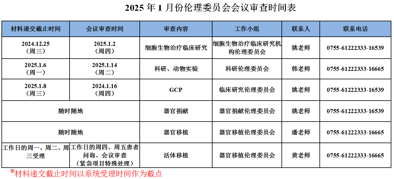伦理委员会2025年1月会议审查时间安排如下,如有临时调整,将另行通知。