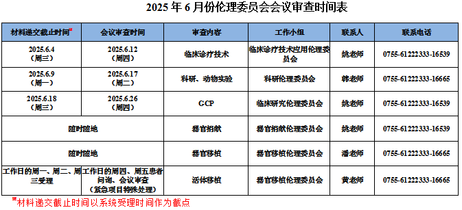 伦理委员会2025年6月会议审查时间安排如下,如有临时调整,将另行通知。
