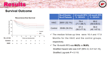 本次大会上,蔡庆贤教授报告了170例接受局部消融治疗的,直接超过3cm的干细胞癌患者的术后复发情况。研究结果显示,相对于没有进行术后HAIC治疗的患者,接受术后HAIC治疗的患者术后复发风险显著降低。