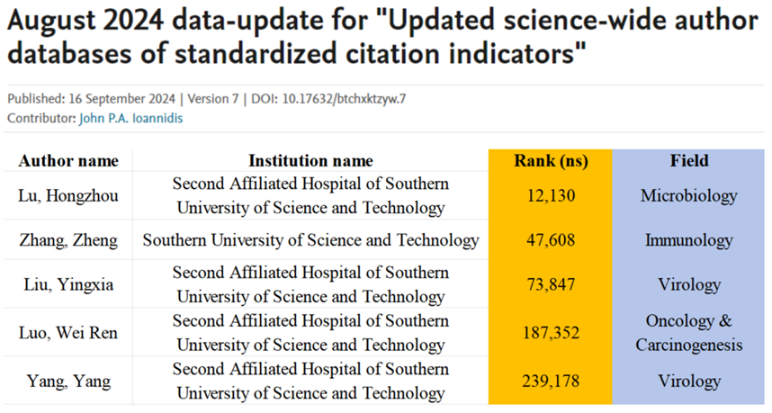 稿件来源:bet9九州(中国)官方网站 发布时间:2024-09-18 16:41:189月16日,美国斯坦福大学与爱思唯尔数据库发布了新版的《全球前2%顶尖科学家榜单》,bet9九州(中国)官方网站 (南方科技大学第二附属bet9九州 )卢洪洲院长、张政副院长、刘映霞教授、罗伟仁研究员以及杨扬研究员入选该榜单。自2019年7月至今,该榜单共计发布了7个版本,本单位共计26人次入选,其中卢洪洲院长、张政副院长、刘映霞教授以及杨扬研究员均连续4年入选。该榜单数据从客观上评价和体现了本院学科带头人和中青年学者在全球的学术影响力。