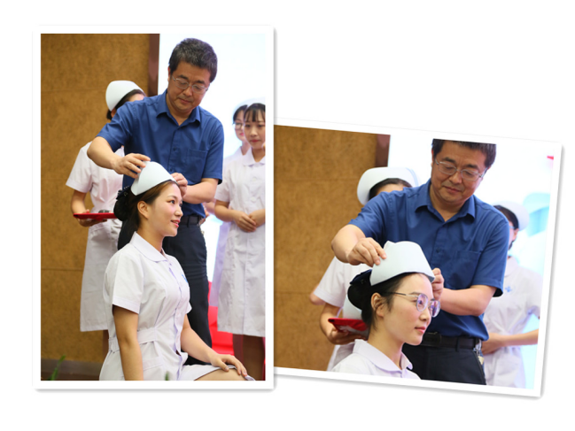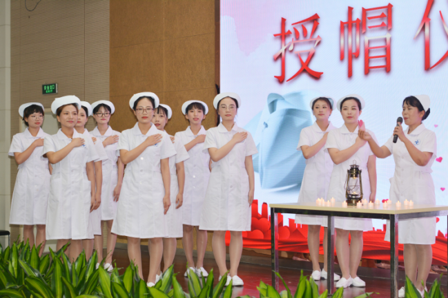 伴随着庄严舒缓的乐曲,20名新护士代表手托蜡烛缓缓上台,爱的火种渐渐在舞台中央汇聚成为一颗大爱之心。何清副院长为女护士戴上圣洁的燕尾帽,护理部操静主任为男护士整冠正容,新护士们在郑国琴护士长带领下庄严宣誓。庄重的仪式,神圣的誓言,这是一份使命的传承,更是一项守护生命的重任。