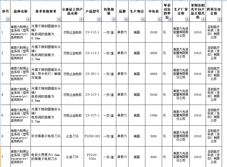 美敦力射频止血系统(型号Aquamantys)医用耗材中标公告